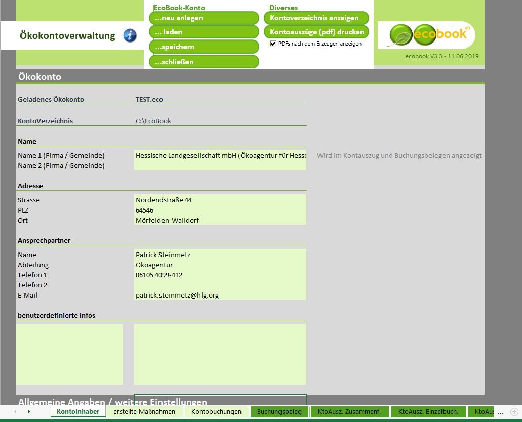 Das geladene/geöffnete Ökokonto wird zusammen mit seinem Kontoverzeichnis/Dateipfad automatisch angezeigt.