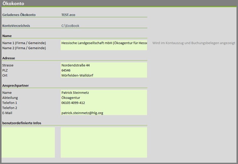 Den Namen des Kontoinhabers können Sie für das aktuell geladene/geöffnete Ökokonto ändern und speichern. Ebenso wie die Adresse, Ansprechpartner und benutzerdefinierte Infos.