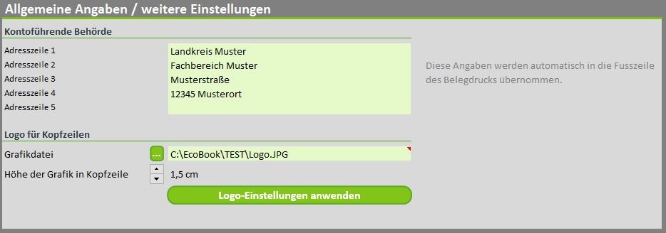 Über die Einstellung „Höhe der Grafik in Kopfzeile" können Sie die Größe des Logos anpassen. Am besten testen Sie in einem Test-EcoBook wie es auf den Buchungsbelegen und Kontoauszügen aussieht.